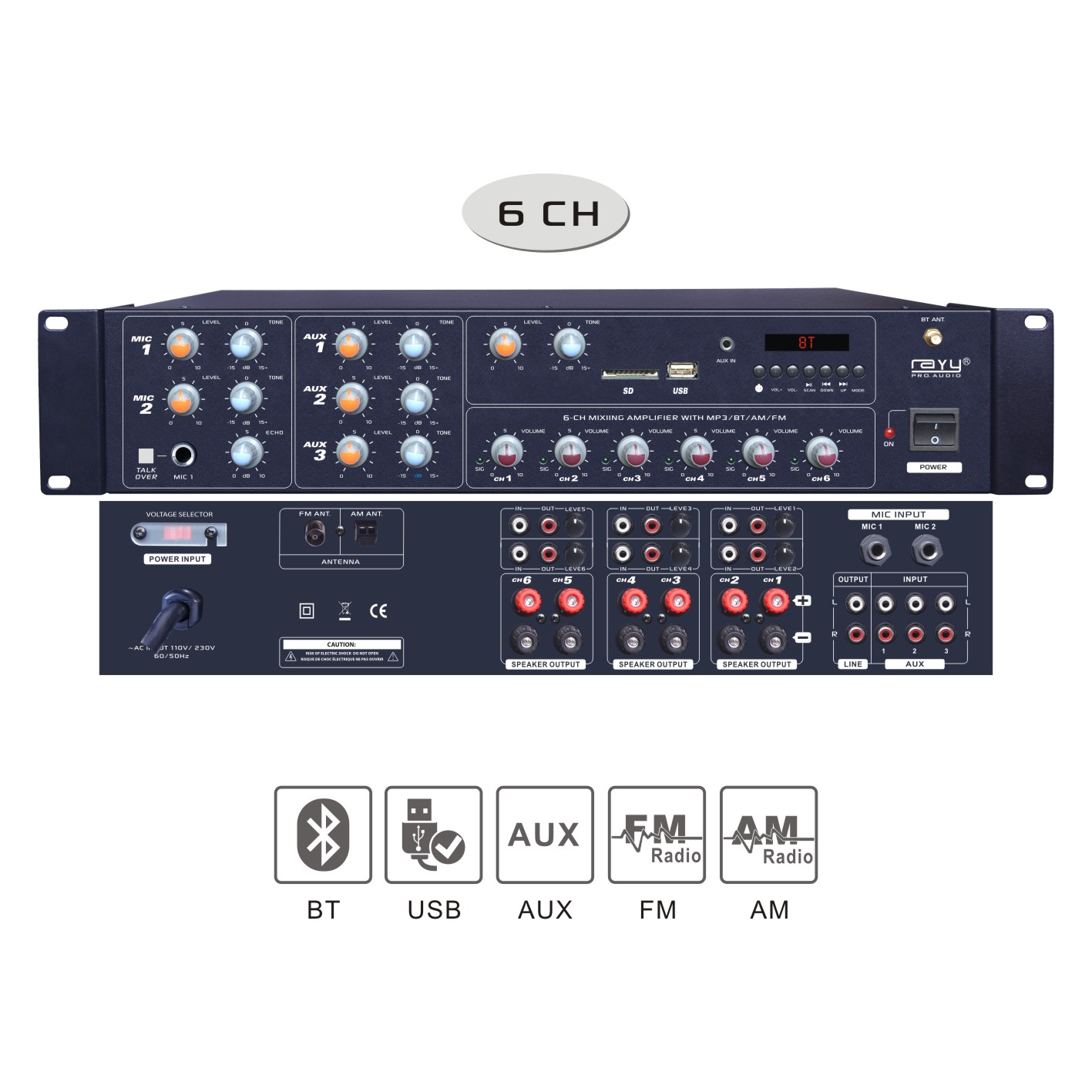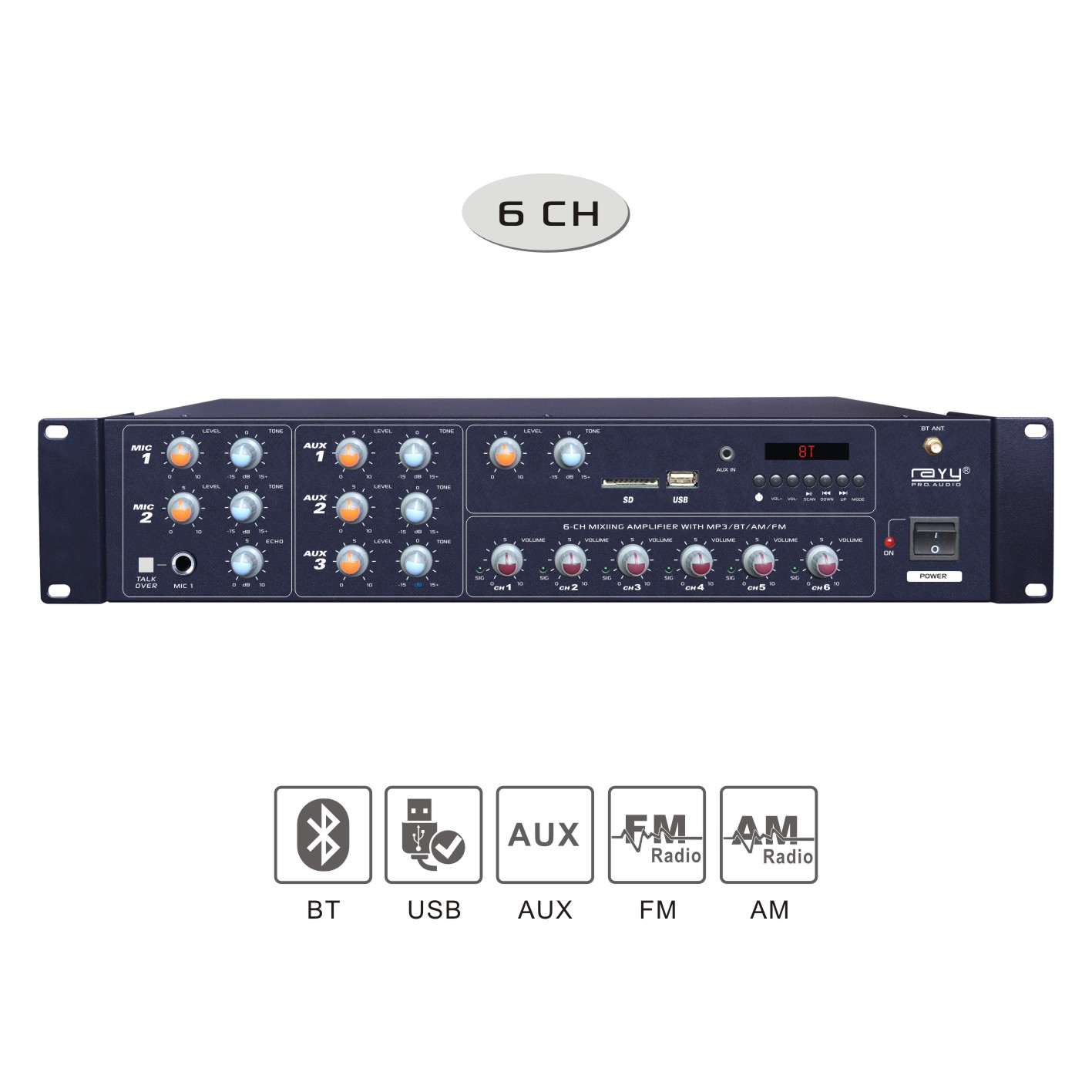 Professional Mixing amplifier w/ Bluetooh, MP3 Player, AM/ FM Tuner & 3.5mm,Talk Over and AUX Input