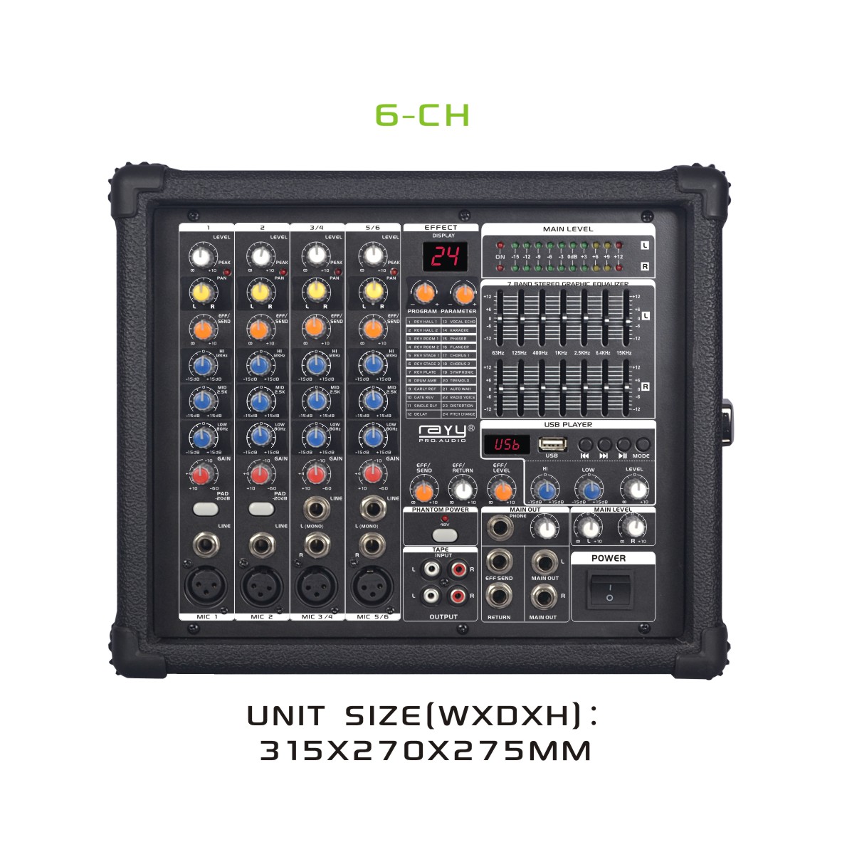 • Totally 6-CH Audio Mixing System with 6 Mono MIC Input & 2 Stereo Inputs