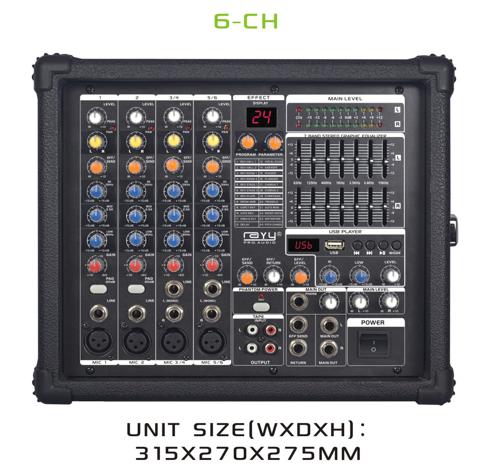 6-CH BT AUDIO POWERED MIXER WITH MIC & LINE INPUTS, MP3 PLAYER, 24 PROGRAMS OF DIGITAL DSP EFFECT & 48V PHANTOM POWER SUPPLY