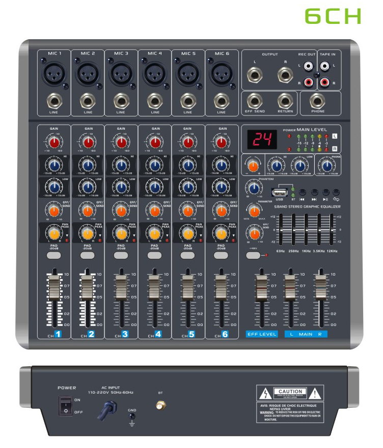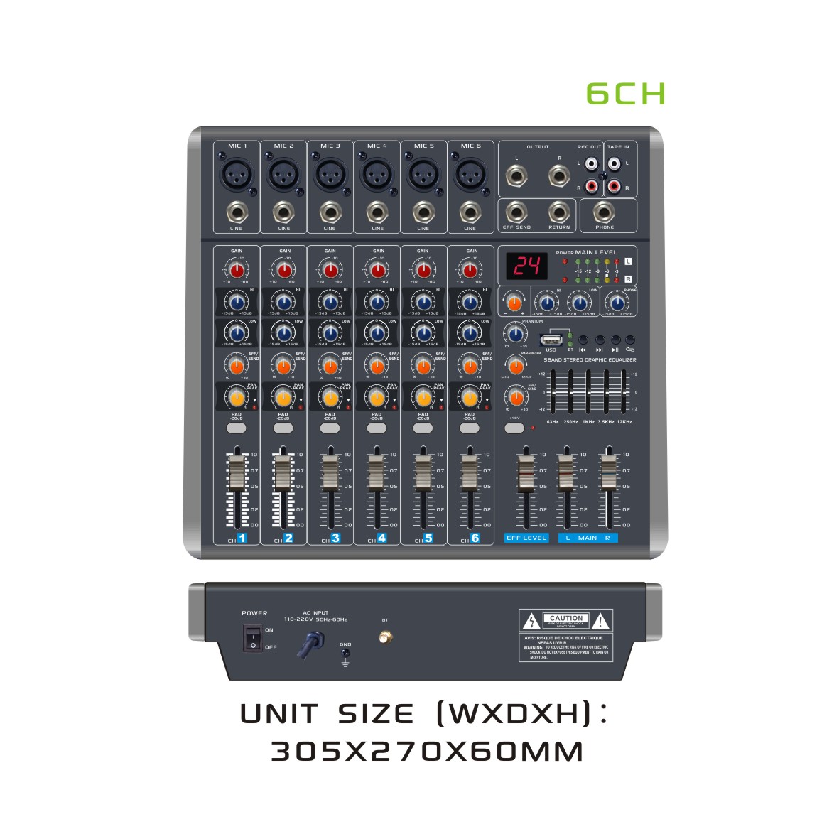 •Totally 8-CH Audio Mixing System with 6 Mono MIC Input & 2 Stereo Inputs
