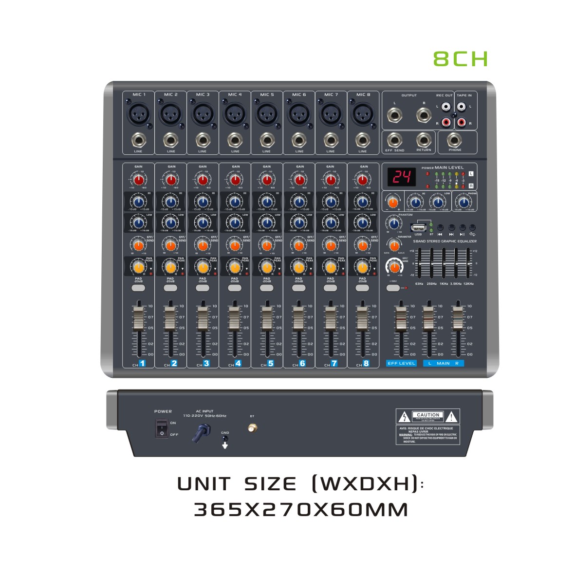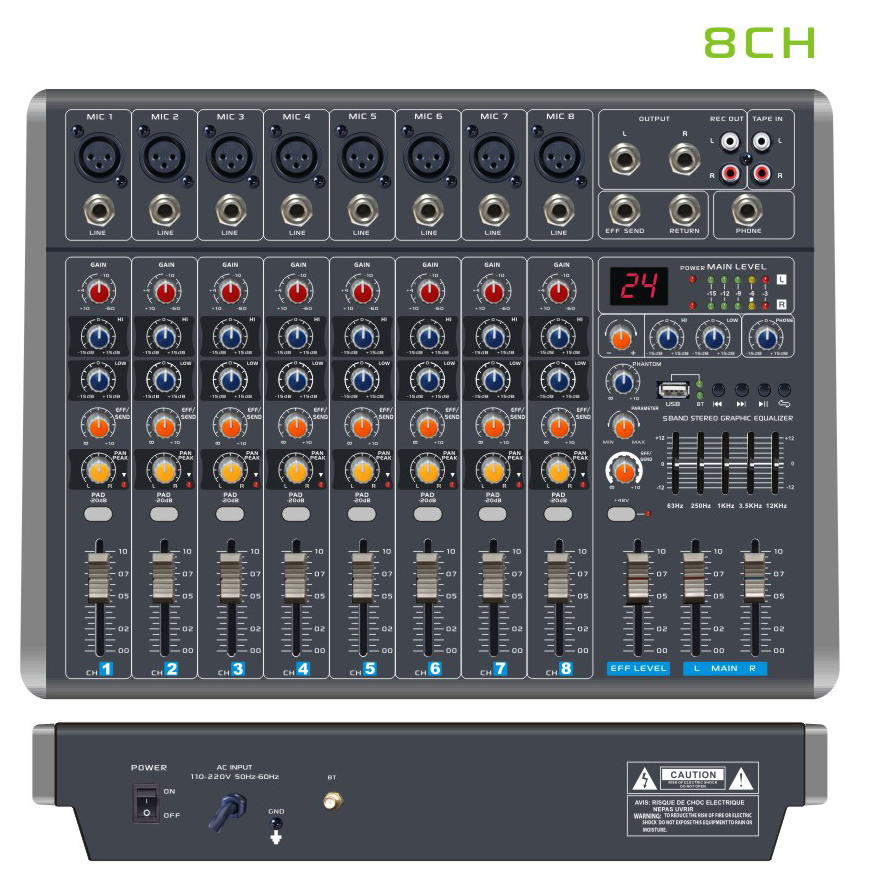 •Totally 8-CH Audio Mixing System with 6 Mono MIC Input & 2 Stereo Inputs