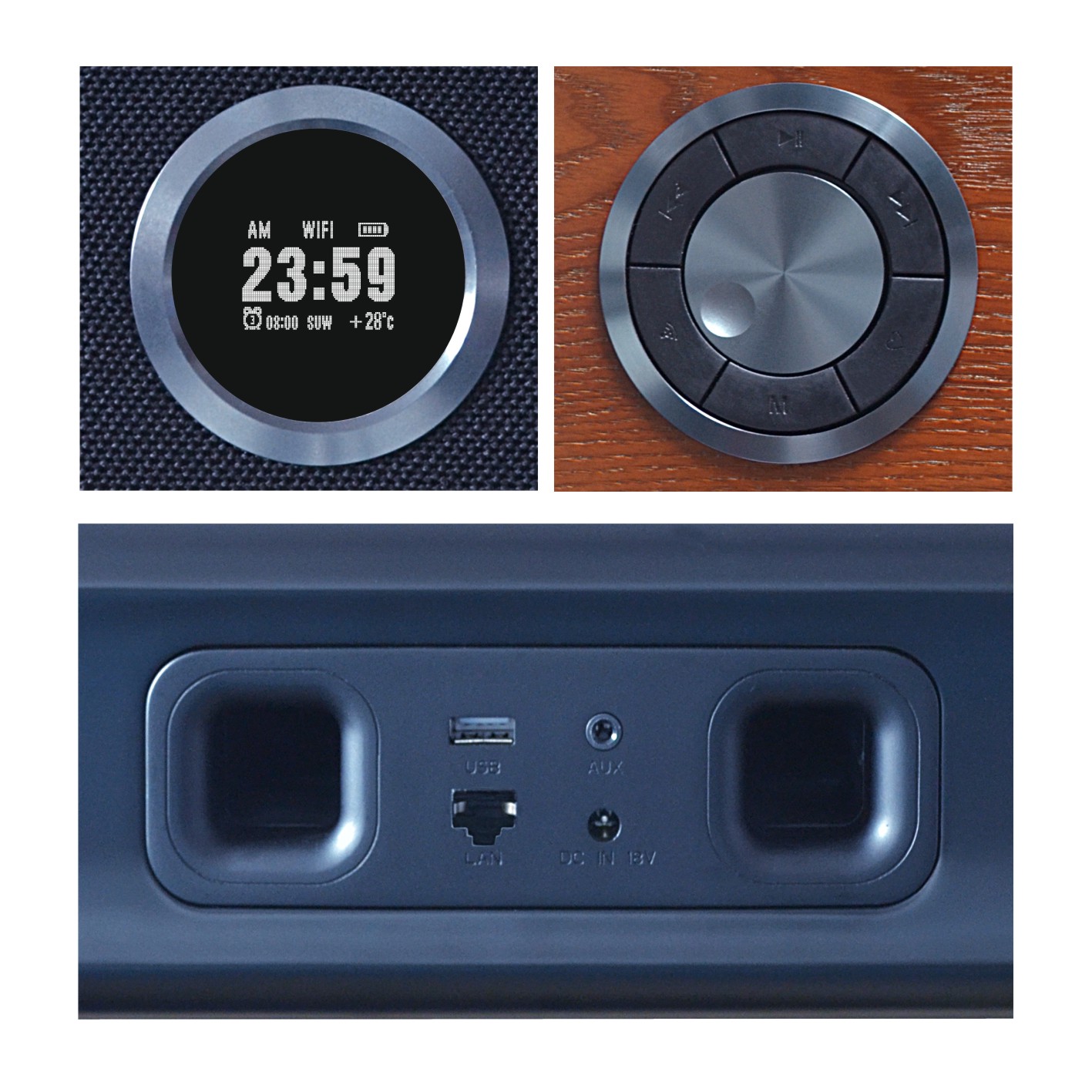 Wood Cabinet and with its dual 3/4" Tweeter and dual 3" acoustic Mid-Bas drivers and frequency response of 70Hz-20KHz, can stream loud and crystal clear stereo sound with room filling powerful sound, and perfect for home, dorm room, kitchen, car, parties; And each speaker can stream L/R channels to create surround sound experience.