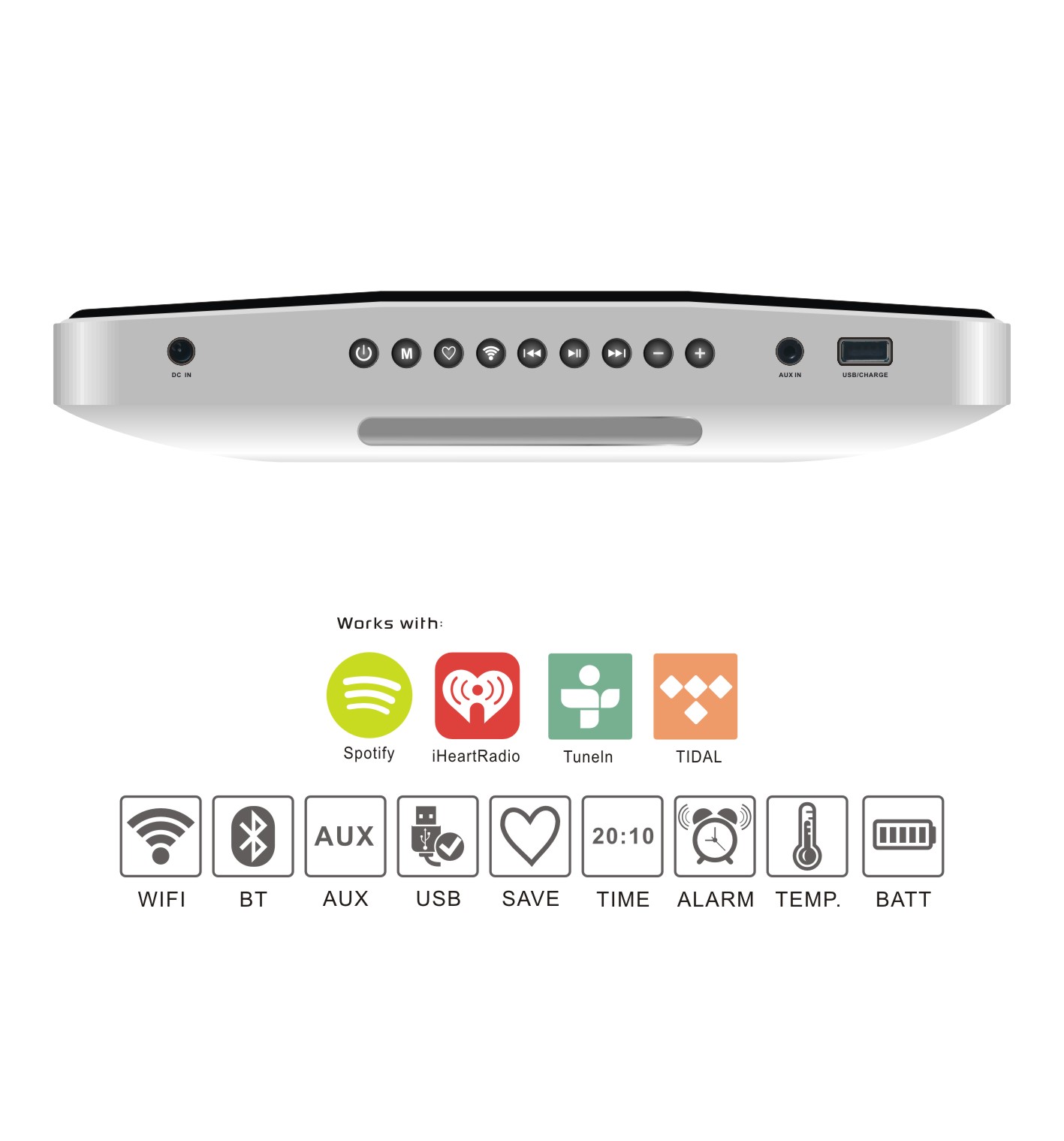 •Audio Input: WIFI/BT/AUX/USB PLAYER